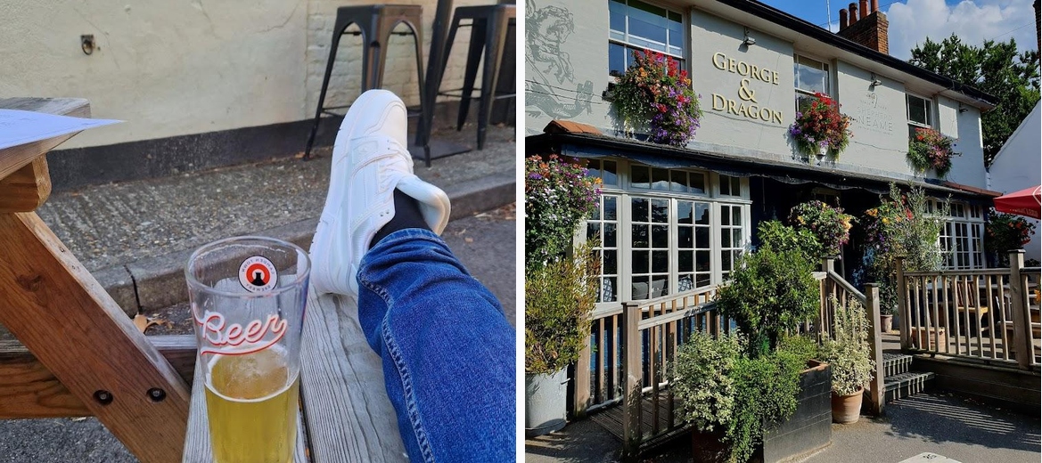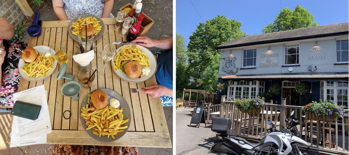 We went to the george and dragon last night (Mon 29th) and had a lovely dining experience. We were greeted by friendly and attentative staff who had good knowledge of the drinks and ordering process. We then proceeded to the garden which is well kept and a really nice space for outdoor dining and watching sport. The atmosphere was friendly and welcoming this was helped by how polite and helpful the staff where. The food arrived in good timing and we where all pleasantly surprised at how large the portions are. We each had a burger and thoroughly enjoyed them! The beef burger was tender and super flavourful and the chips where crispy and fresh! Overall i would highly recomend this pub and hope to return in the future. 10/10